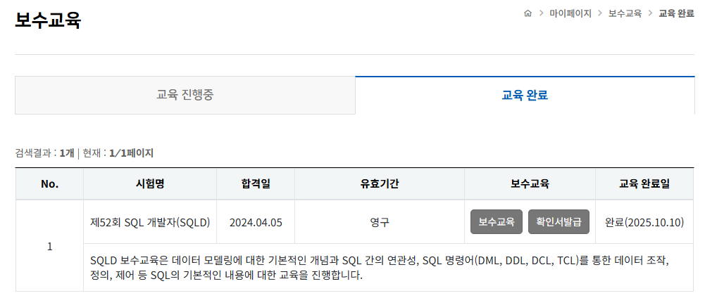 SQLD가 비교적 취득이 쉬운 자격증이긴 하나 잊지 말고 보수 교육을 완료해 영구 취득으로 전환하도록 하자!